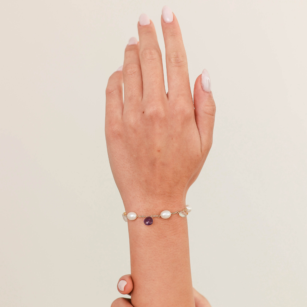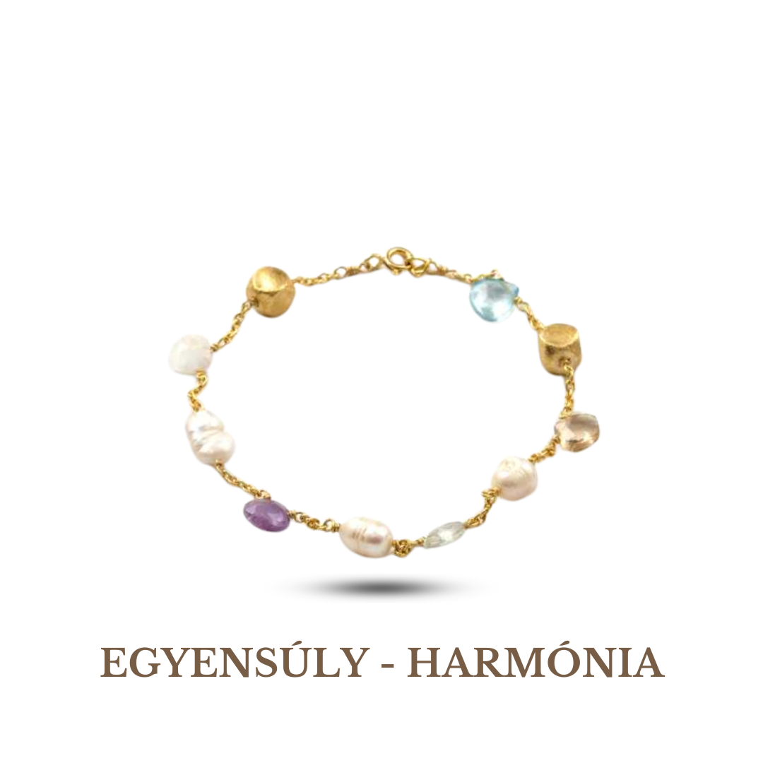 Fedezd fel a valódi kézműves ékszerek világát ezzel a gyönyörű karkötővel, amely arannyal bevont 925-ös sterling ezüstből készült, és különleges ásvány kövekkel van díszítve: ametiszttel, kék topázzal, citrinnel, zöld ametiszttel és gyönggyel.