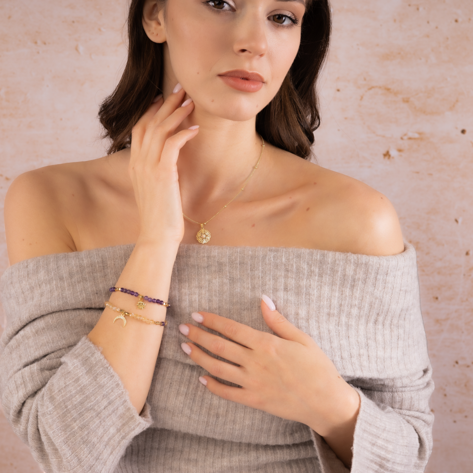 Ékszer anyaga: 4 mm citrin kő - hematit kő - ametiszt kő -18K aranyozott 925 sterling ezüst charm logó- rugalmas ékszerdamil