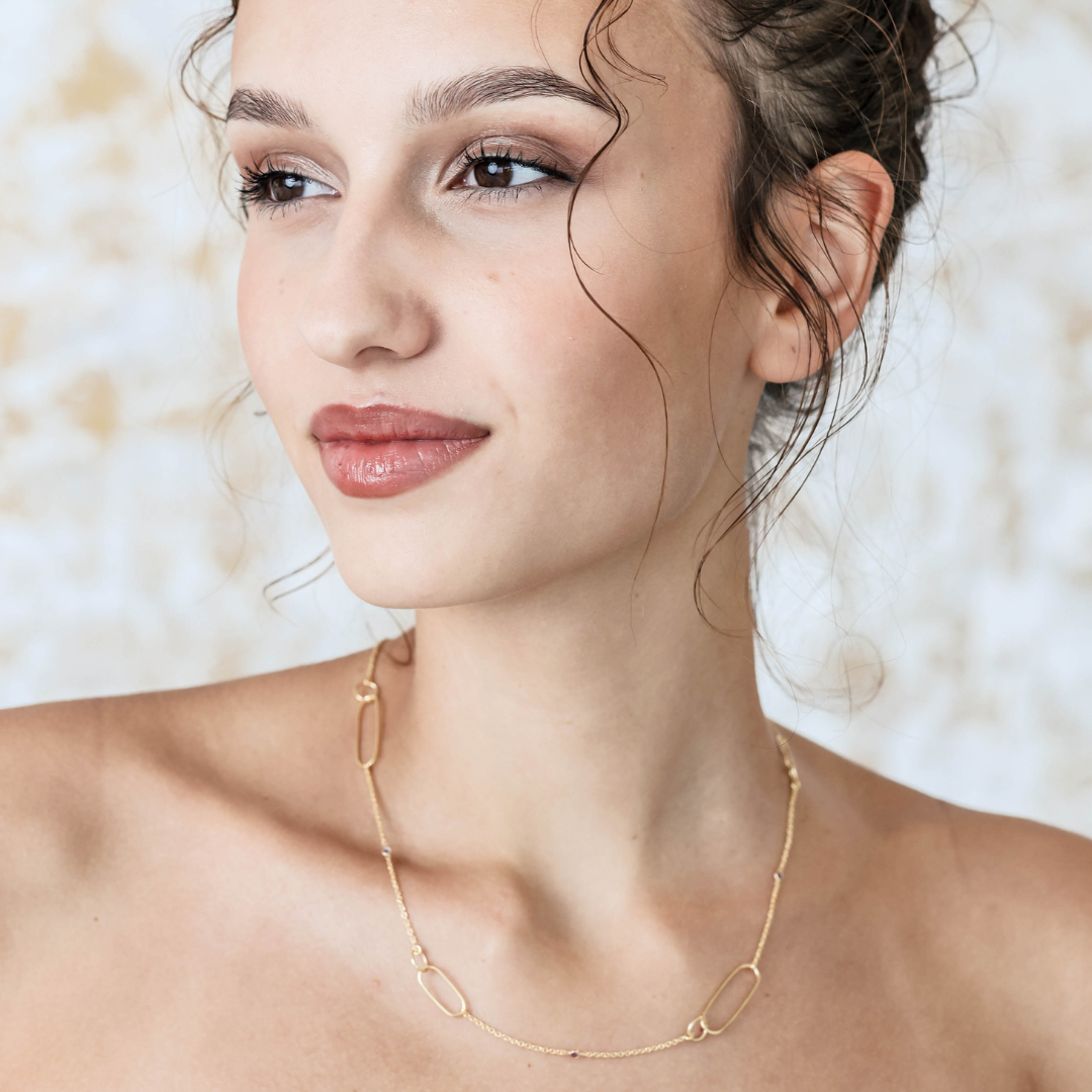 Fedezd fel a valódi kézműves ékszerek eleganciáját ezzel a lenyűgöző nyaklánccal, amely arannyal bevont 925-ös sterling ezüstből készült, és gyönyörű ametiszt kövekkel van díszítve. Minden darabot gondosan terveztek, ismerd meg ennek a varázslatos kőnek a nyugtató energiáját.